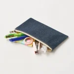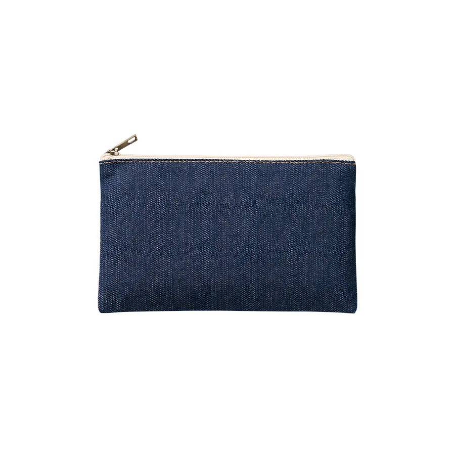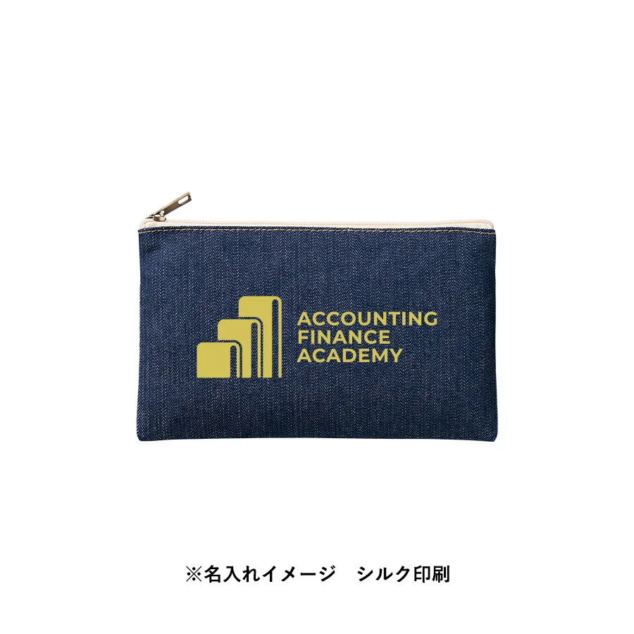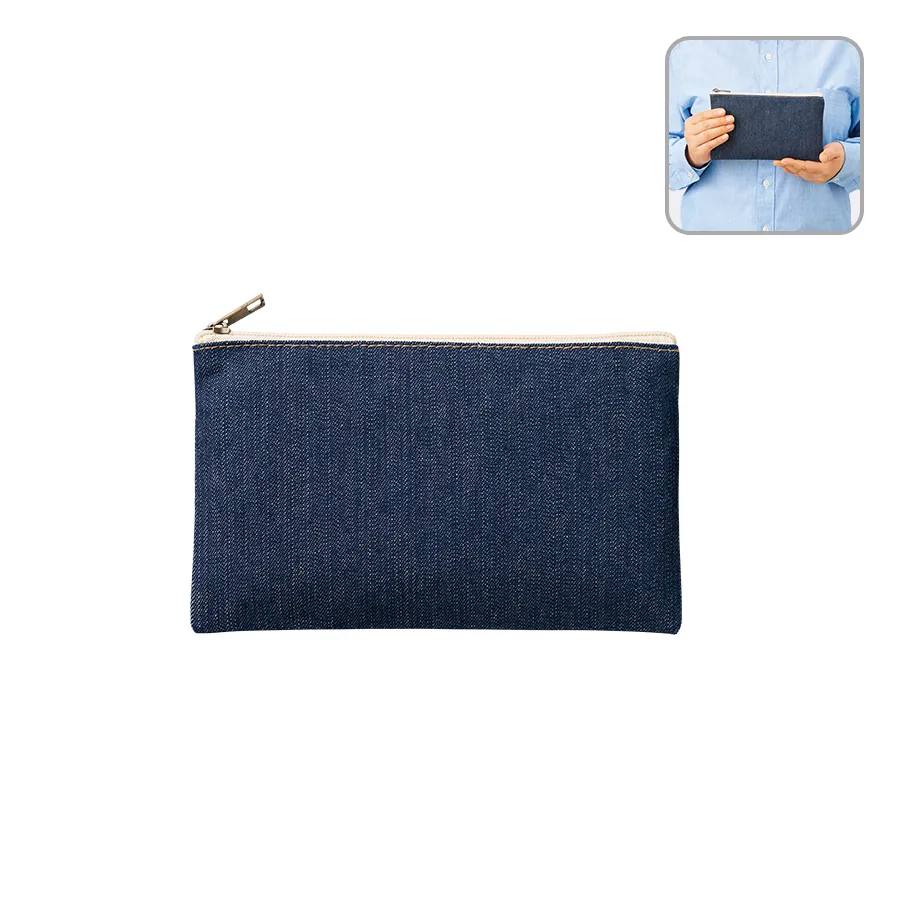 フラットタイプで使いやすい、おしゃれな印象のデニムポーチです。 SS・S・Mサイズの3サイズ展開で、Sサイズは横型なのでペンケースや、 コスメポーチなどとしてもおすすめです。 ファスナーの引き手部分はデニムと相性の良い、アンティークゴールドの色味になっています。 男女ともに使っていただきやすいカジュアルさがポイントです。 単色印刷のほか、フルカラー印刷も可能なため ノベルティはもちろん、デニムを生かした物販品としてもご提案いただけます。